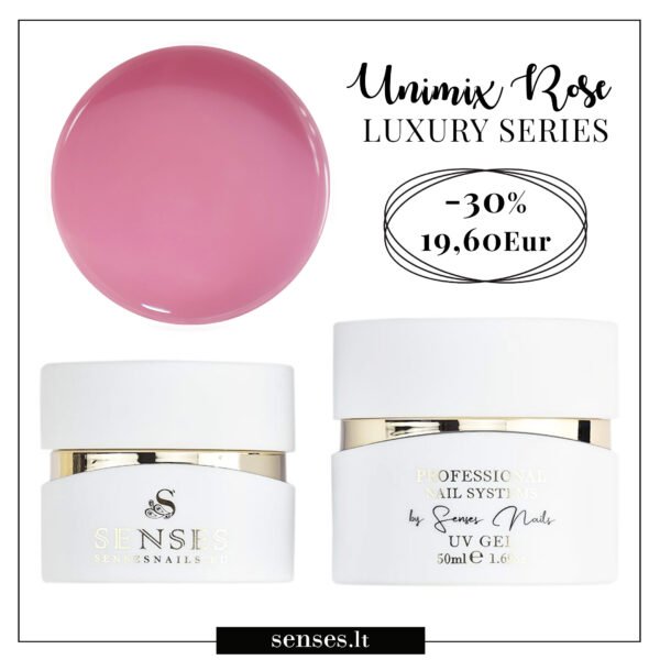 UniMix Rose – lėtai išsiliejantis, švelniai rausvos spalvos(ant nago) gelis. Maskuoja nago plokštelę 70% bei polimerizacijos metu nekaitina jos. Tinkamas visoms nagų procedūroms: natūralių nagų padengimui geliu, nagų priauginimui, korekcijai, prancūziškam dizainui.